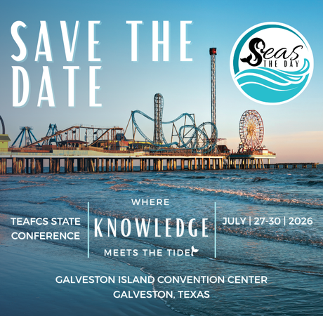 Pack your sunscreen and get ready for sun, sand, and inspiration at the 2026 TEAFCS State Conference! Join us July 27–29, 2026, on Galveston Island – where knowledge meets the tide. Expect energizing sessions, meaningful connections, and a splash of Gulf Coast charm.